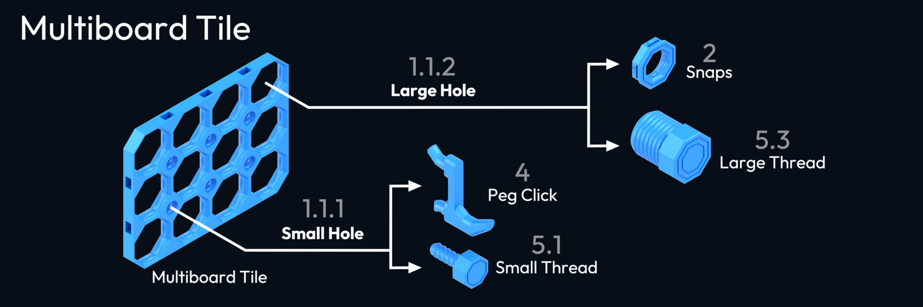 - Screws into Large Holes (Multi Holes), found on the Multiboard Tiles.