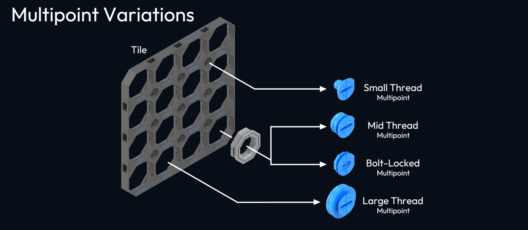 Multipoint is a connection system for easily connecting different parts together. It also serves as a bridge between Multibin Parts and Multiboard Tiles.