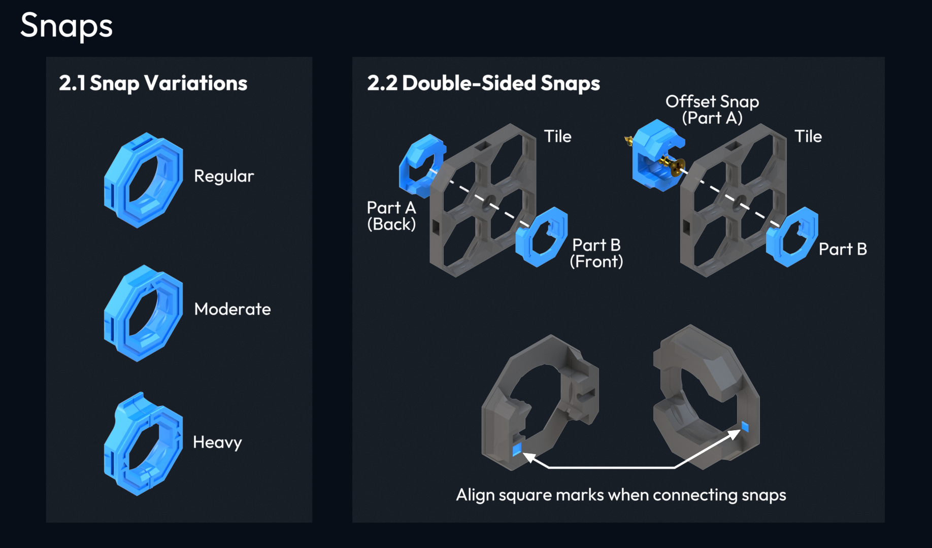 - Offset Snap Mounts (DS Part A): They create a 6.25 mm offset from the surface and have a screw hole for mounting it to a wall. Learn more in the Tile Mounting Guide.