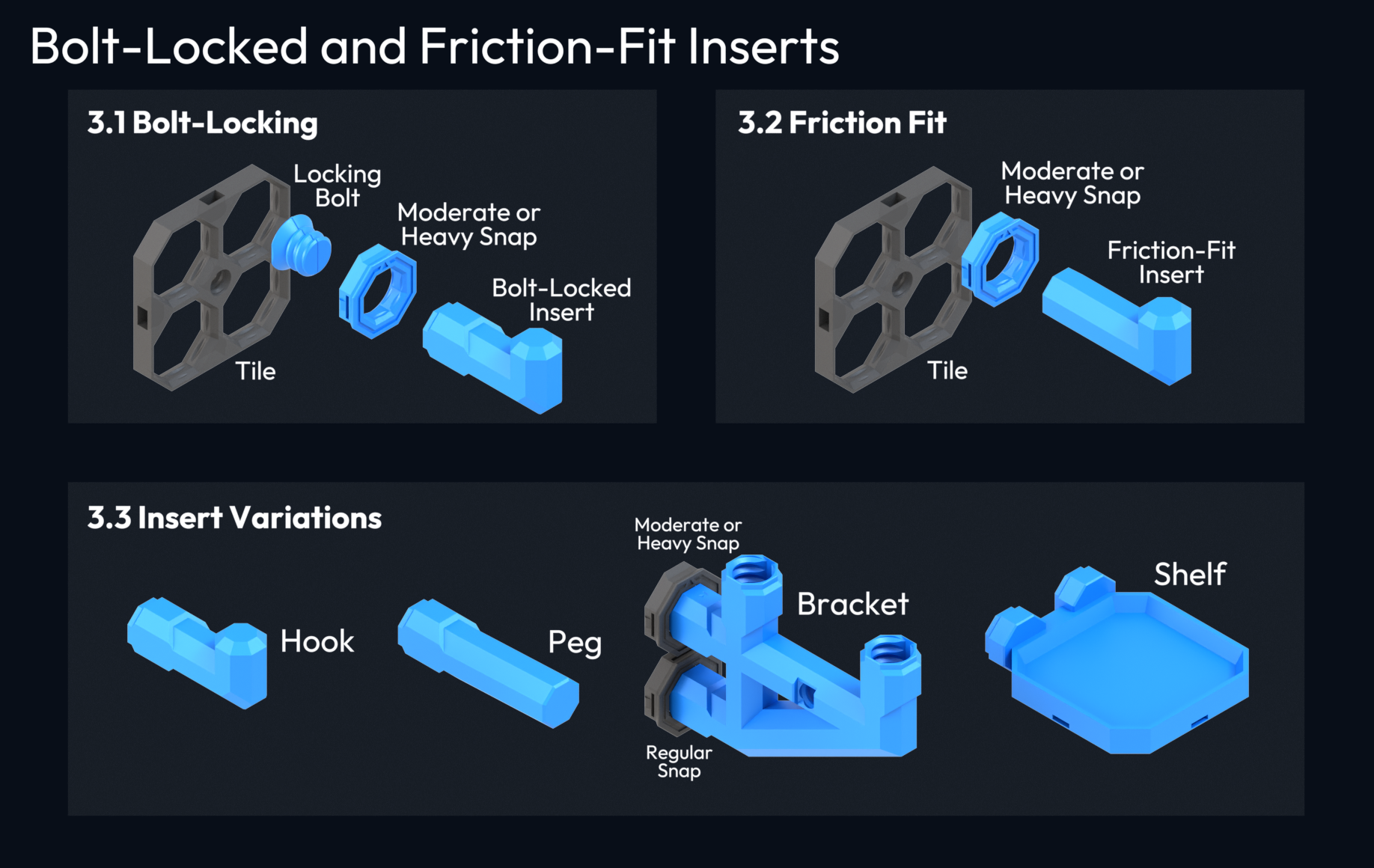 Bolt-Locked or Friction Fit inserts can have any functional variation. The most common variations are hooks, pegs, shelves, and brackets.
