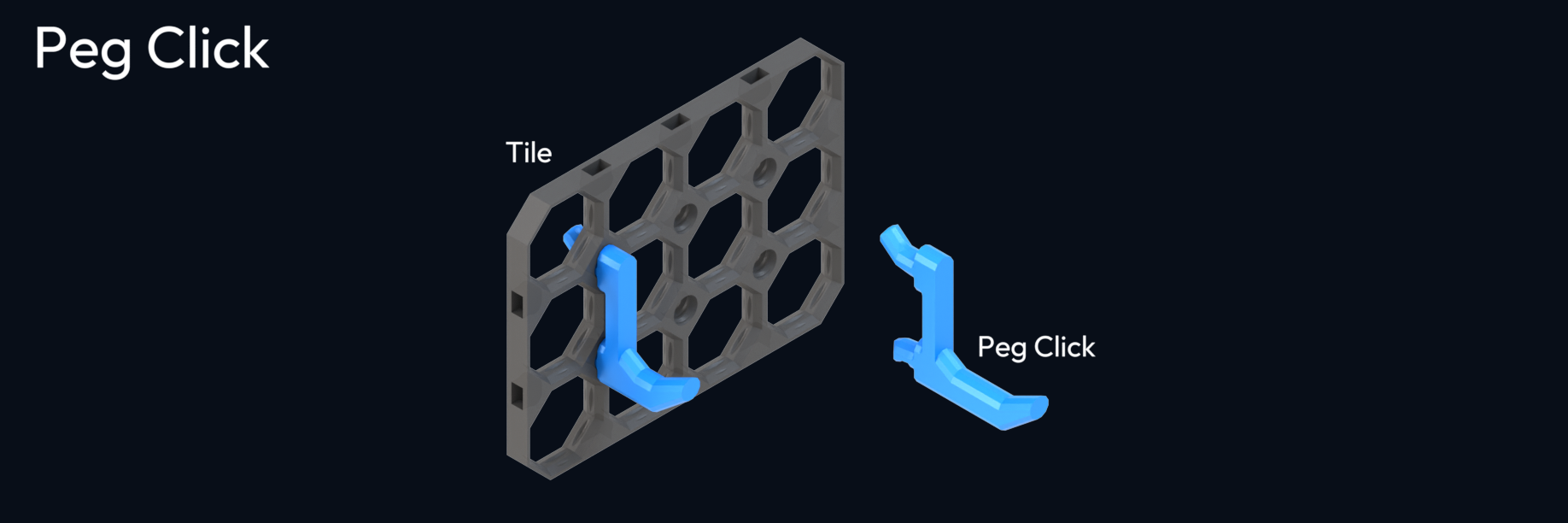 A "Peg Click" connects to two Small Holes on the Multiboard Tiles, just like a pegboard accessory. The "Peg Click Hook" is the easiest way of attaching a hook to a tile.