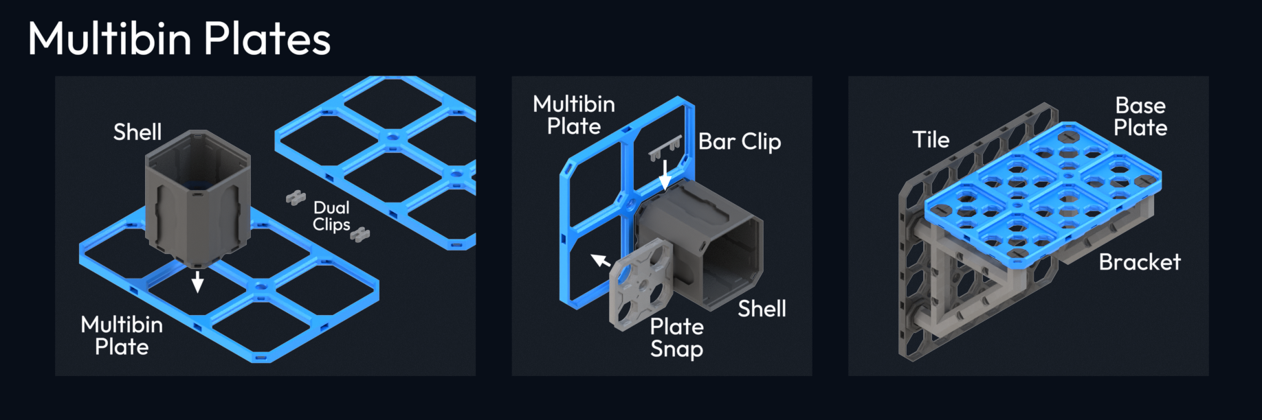 Base Plates: Base Plates are like Multibin Plates, but have a base with connection holes that can be attached to a bracket and to the Multiboard Tiles.