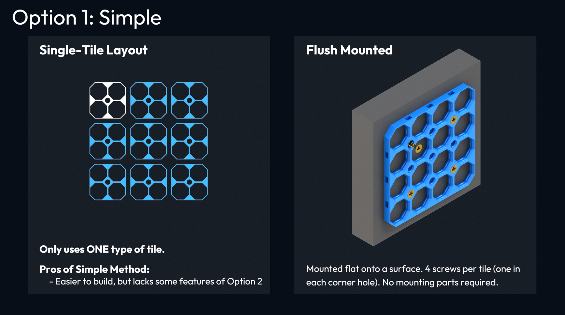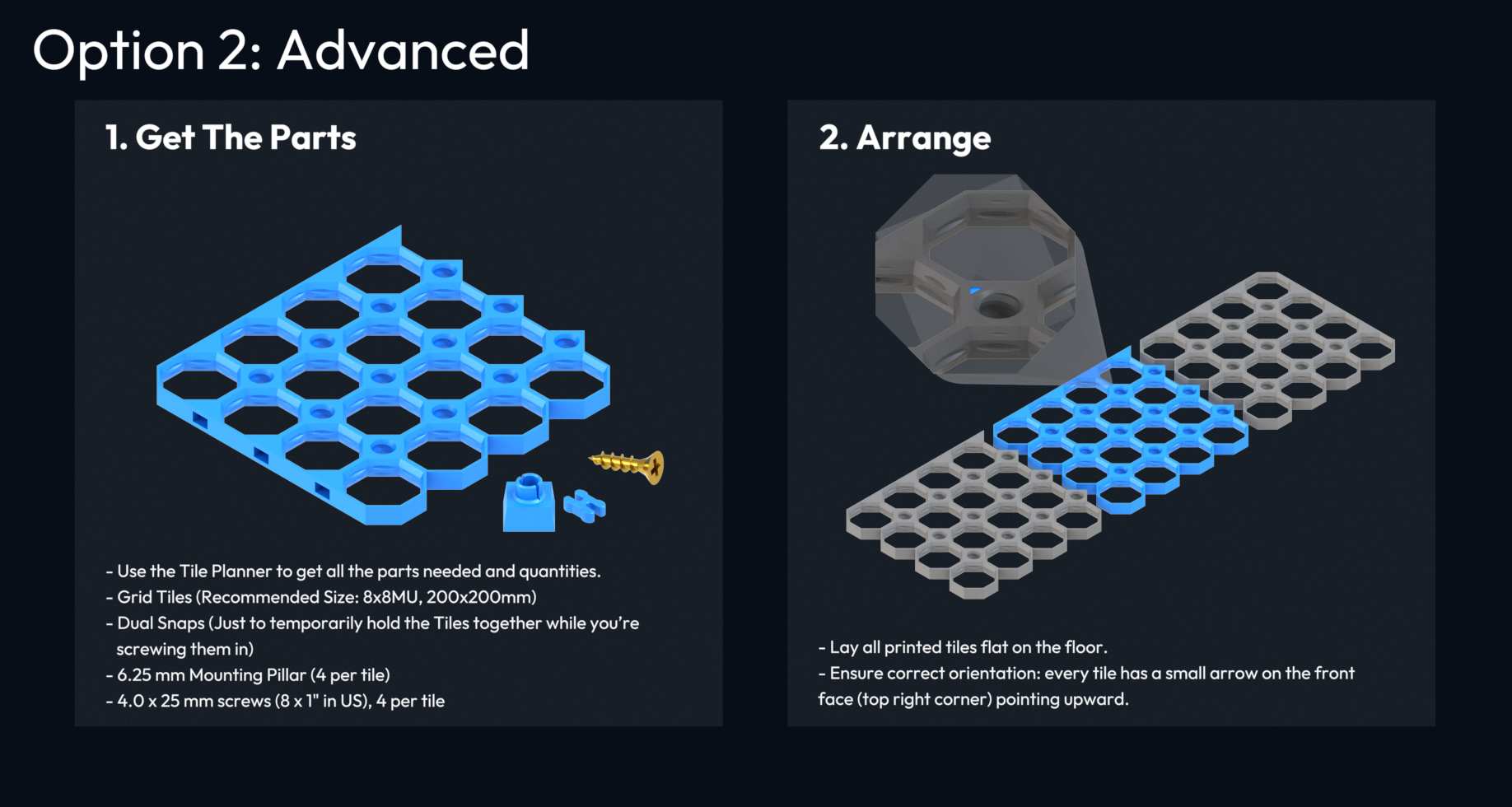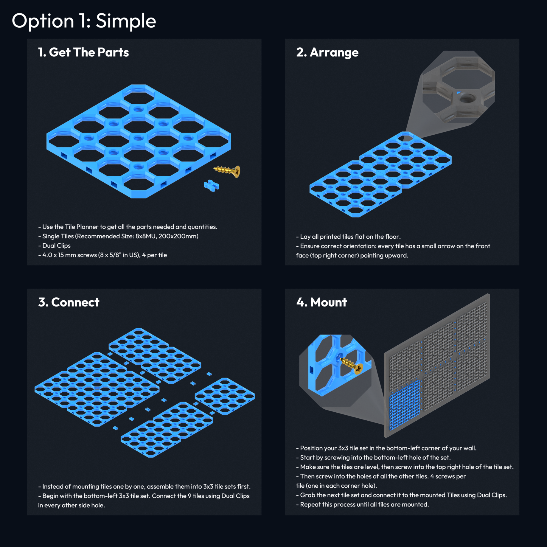 - Instead of mounting tiles one by one, assemble them into 3x3 tile sets first.