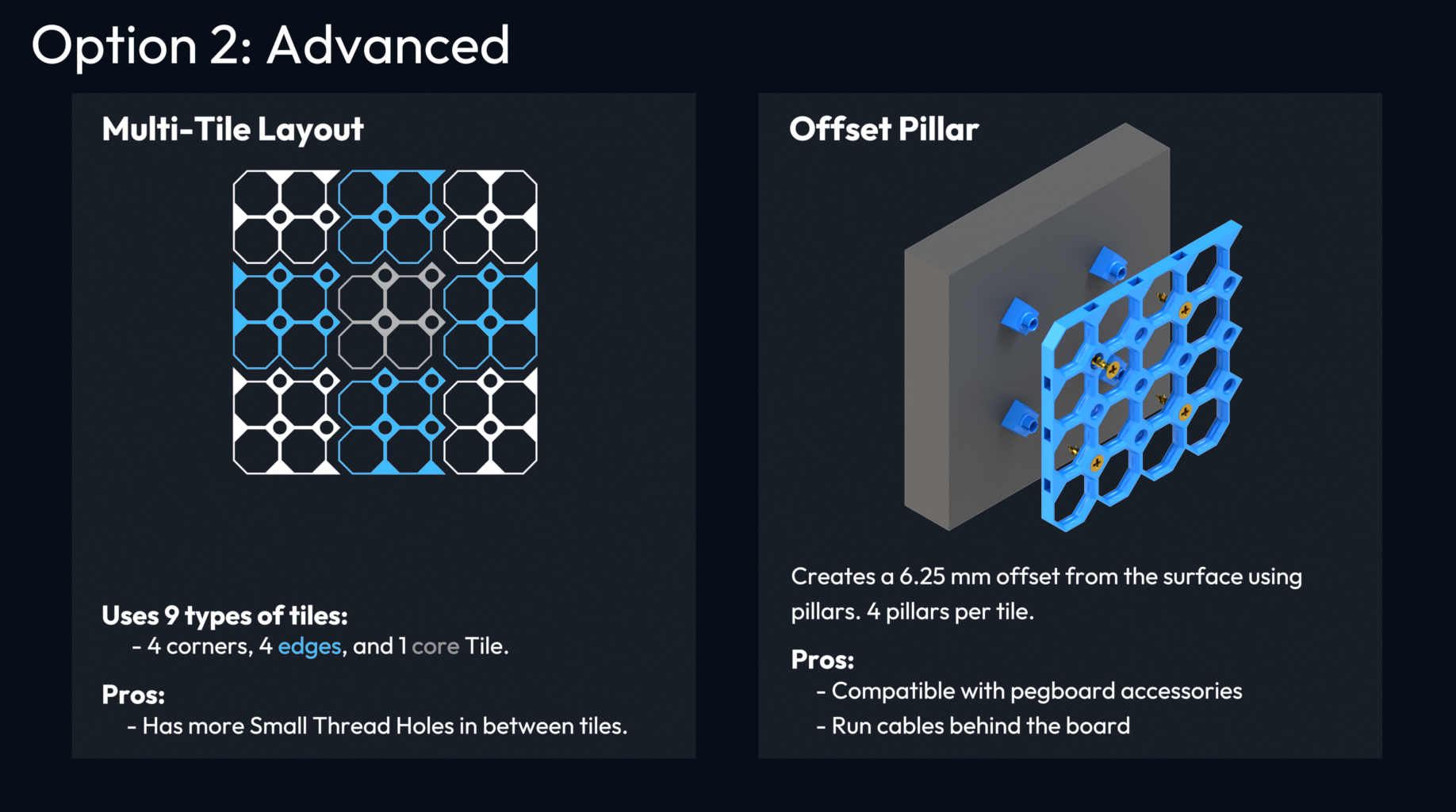 - Insert Offset Pillars into the back of the tiles — 4 per tile (one in each corner hole).